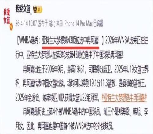 众所周知,昨天中国女篮为备战2026年国际篮联女篮世界杯及名古屋亚运会,中国篮协官宣新一轮中国女篮集训名单。这份名单一共有19人,值得一提的是,无缘入选中国女篮集训名单的一位队员,却今天在WNBA选秀大会上被亚特兰大梦想第43顺位选中。这真的有些出人意料,也引起中国球迷的热议。