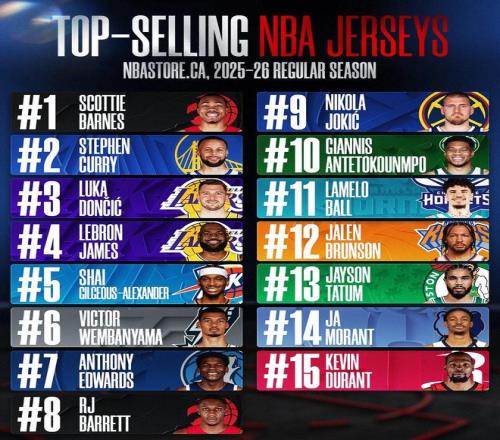 NBA加拿大官方社交媒体账号公布了本赛季NBA球衣在加拿大地区的销量排行榜,多伦多猛龙的球员斯科蒂-巴恩斯销量位列第一,勇士队的斯蒂芬-库里位列第二。