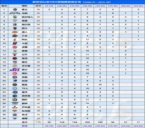 先看上限。65+的胜场,26个赛季以来只出现过11次,勇士独占3次,其余8队各1次。