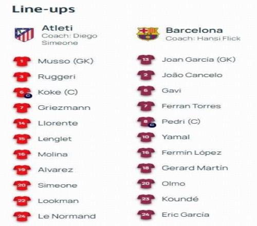 北京时间4月15日3:00,欧冠1/4决赛次回合,马竞坐镇利雅得航空大都会球场迎战巴萨,本场主裁判为蒂尔潘,首回合马竞客场2-0巴萨,赛前双方首发出炉。 罗德里戈免费观看_十大中场免费观看_马德里竞技免费观看_罗德里戈高清在线_十大中场高清在线_马德里竞技高清在线