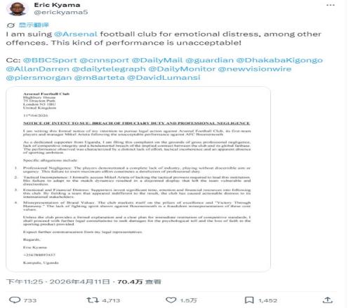 阿森纳的恐慌情绪从球场内扩散到看台,甚至国外。一名乌干达的阿森纳球迷在社媒账号贴出准备起诉阿森纳的警告信,信中指责阿森纳管理层渎职、战术混乱,令球迷遭受情感和经济损失。近期表现证明球队缺乏努力和竞技雄心,无法体现俱乐部“追求卓越”的价值观。这位非洲球迷声称若球队再拿不出立刻恢复竞技水准的计划,将以受到“精神创伤”为由起诉阿森纳并索赔。警告信迅速在社媒平台走红,大量球迷的不满情绪蔓延,又带给了球队更大的心理压力。