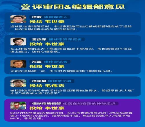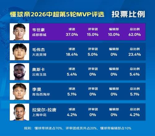 大家好,欢迎来到懂球帝2026赛季中超MVP的评选现场。成都蓉城队长韦世豪凭借与国安一役中的出色表现,以62%的得票率大幅领先,成功当选!