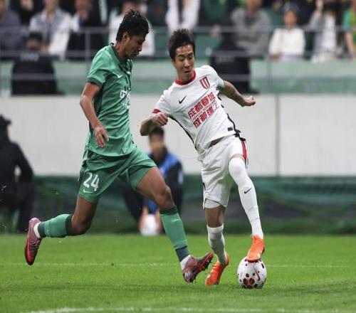 4月12日,成都蓉城队球员韦世豪(右)在比赛中控球。 4月12日,在2026赛季中国足球超级联赛第五轮比赛中,北京国安队主场1比2不敌成都蓉城队。 新华社记者 廖宇杰 摄