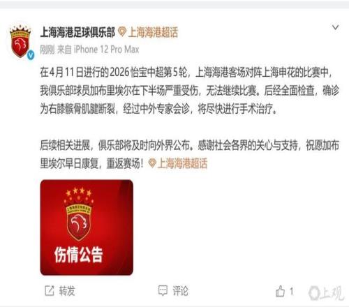 4 月 12 日,上海海港俱乐部发布伤情公告:在4月11日进行的2026怡宝中超第5轮,上海海港客场对阵上海申花的比赛中,我俱乐部球员加布里埃尔在下半场严重受伤,无法继续比赛。后经全面检查,确诊为右膝髌骨肌腱断裂,通过中外专家会诊,将尽快进行手术治疗。后续相关进展,俱乐部将及时向外界公布。感谢社会各界的关心与支持,祝愿加布里埃尔早日康复,重返赛场!